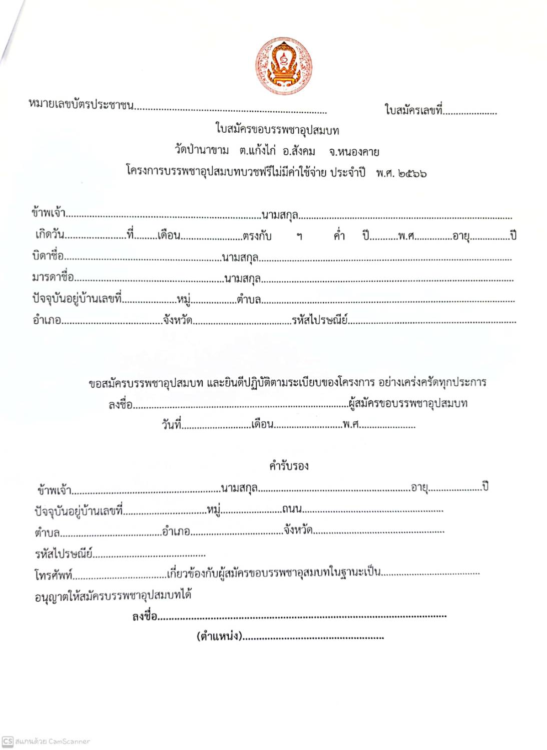 ประชาสัมพันธ์โครงการบรรพชาอุปสมบท “วัดป่านาขาม” 2 มิถุนายน 2023 โดย admin / ข่าวประชาสัมพันธ์ ด้วย วัดป่านาขาม ได้จัดทำโครงการบรรพชาอุปสมบทประจำปี 2566 โดยเป็นการบรรพชาอุปสมบท บวชฟรี ไม่มีค่าใช้จ่าย ปรากฎรายละเอียดตามเอกสารที่แนบมาพร้อมนี้