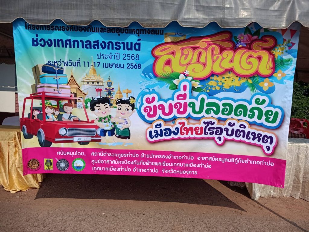 เปิดศูนย์ปฏิบัติการร่วมป้องกันและลดอุบัติเหตุทางถนนช่วงเทศกาลสงกรานต์ พ.ศ.2568 11 เมษายน 2025 โดย admin / ข่าวภารกิจผู้บังคับบัญชา วันที่ 11 เม.ย. 68 เวลา 09.00 น. โดยการอำนวยการของ พ.ต.อ.เตชรัฐ ประทุมชาติ ผกก.สภ.ท่าบ่อ มอบหมายให้ พ.ต.ท.สุเวช ศรีแนน รอง ผกก.(สอบสวน)ฯ พ.ต.ท.นักรบ แสงจันโท สวป.สภ.ท่าบ่อ พ.ต.ต.อิทธิพล ปาณะพรหม สวป.(ชส.)สภ.ท่าบ่อ ร่วมพิธีเปิดศูนย์ปฏิบัติการร่วมป้องกันและลดอุบัติเหตุทางถนนช่วงเทศกาลสงกรานต์ พ.ศ.2568 ณ จุดตรวจหลักสี่แยกไฟแดงน้ำโมง โดยมีนายสมควร ใจซื่อ นายอำเภอท่าบ่อ เป็นประธาน มีภาคีเครือข่าย และกำลังพลจิตอาสา สภ.ท่าบ่อ ร่วมพิธี