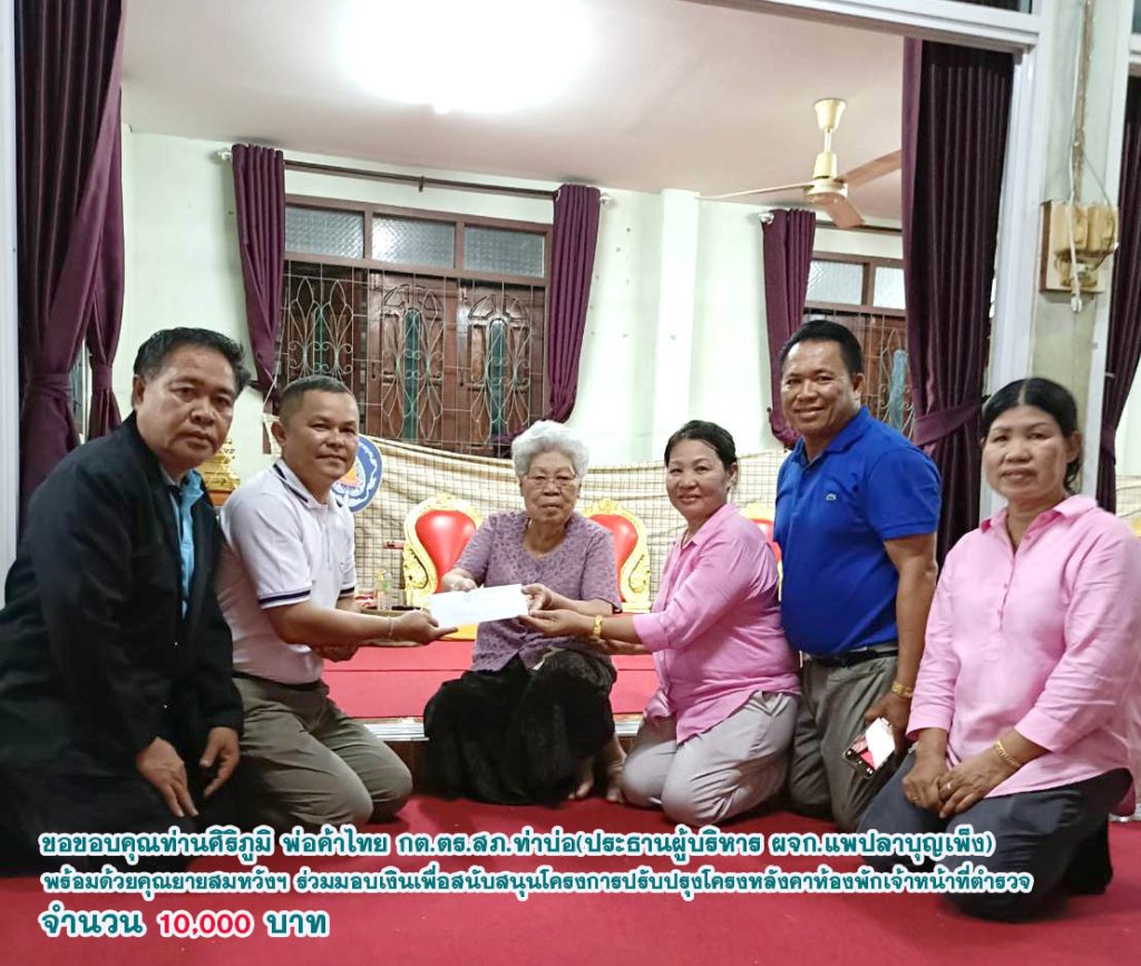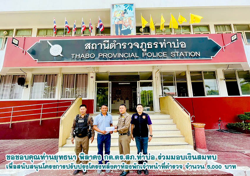 วันที่ 29 ตุลาคม 2567 นายศิริภูมิ พ่อค้าไทย กรรมการ กต.ตร.สภ.ท่าบ่อ พร้อมด้วยคุณยายสมหวัง ได้มอบเงินจำนวนรวม 10,000 บาท เพื่อสนับสนุนโครงการปรับปรุงโครงหลังคาห้องพักเจ้าหน้าที่ตำรวจ พร้อมด้วยคุณยุทธนา พิลาคง กต.ตร.สภ.ท่าบ่อ ยุทธนาฟาร์ม ร่วมสนับสนุน 5,000 บาท รวมทั้งเจ๊หมวย พรทรัพย์ ทักษิโณ ร่วมสนับสนุนแผ่นสังกะสีมุงหลังคาอีกด้วย