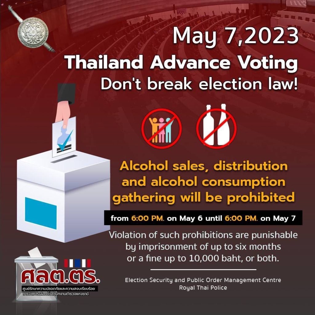 7 พฤษภาคม 2566 วันเลือกตั้ง ส.ส.ล่วงหน้า 6 พฤษภาคม 2023 โดย admin / ข่าวประชาสัมพันธ์ ต้องรู้กฎหมายเลือกตั้ง… ห้ามขาย จำหน่าย จ่ายแจก หรือจัดเลี้ยงสุราทุกชนิด ตั้งแต่ 18.00 น. ของวันที่ 6 พฤษภาคม 2566 จนถึงเวลา 18.00 น. ของวันที่ 7 พฤษภาคม 2566► ฝ่าฝืนมีโทษจำคุก ไม่เกิน 6 เดือน หรือปรับไม่เกิน 10,000 บาท หรือ ทั้งจำทั้งปรับ